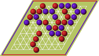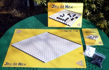 Dans l'exemple ci-dessus, le joueur rouge tente de rejoindre les deux bords rouges (nord-sud) tandis que le joueur violet tente de rejoindre les deux bords de sa couleur (est-ouest). Le jeu est pratiquement introuvable dans le commerce, mais facile à confectionner soi-même, en bois, en paille tressée ou en guano. Hex est assurément l'ancêtre de tous les jeux modernes de connexion. Edition Paper Game chez 3M