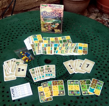 Honshu vous propose de construire des villes en posant et superposant des cartes. Celles-ci comportent des quartiers d'habitation, des forêts, des lacs, des productions et des industries de transformation ainsi que des zones désertiques. En disposant habilement les cartes reçues, vous essayerez de créer des grands lacs et des forêts, de transformer les matières premières gagnées tout en créant une grande ville. La subtilité du jeu tient dans le mécanisme d'acquisition des cartes, mélange d'enchère et de tactique. Le jeu est extrêmement intéressant à 3, 4 ou 5. Un mode de jeu pour 2 joueurs est proposé mais il est moins convaincant. Honshu est d'autant plus indispensable qu'il ne mettra pas à mal vos finances.