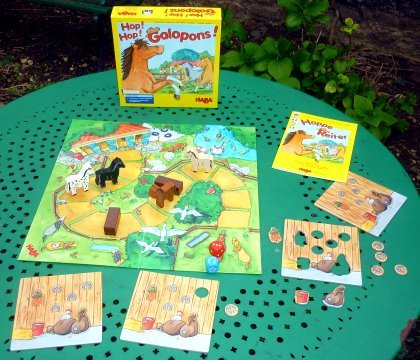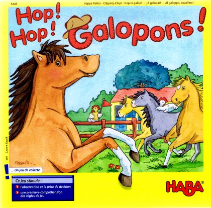 Pour gagner une partie de Hop ! Hop ! Galopons ! il faut démontrer qu'on sait bien s'occuper de son cheval, en plus de le mener à l'écurie le premier. L'idée est fort simple, mais le jeu s'adresse avant tous aux jeunes stratèges. Pour gagner, il faut arriver le premier au bout de la piste tout en ayant complété son tableau des accessoires indispensables. On jette deux dés spéciaux. L'un est numéroté de 1 à 3, l'autre comporte tous les accessoires. Il faut alors choisir : soit avancer, soit remplir son tableau. La petite boîte, bien pleine, contient un matériel de qualité dont quatre jolis petits chevaux.
