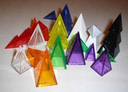 Les pyramides se distinguent par deux caractéristiques : la couleur et la taille. Plus d'une dizaine de couleurs sont disponibles à la vente. La taille varie de 1 à 3. Les pièces peuvent s'empiler de deux façons, soit par ordre croissant, soit par ordre décroissant. Une grande pièce cache totalement une pièce moyenne, qui elle-même peut dissimuler une petite pièce. Icehouse ou Treehouse ?