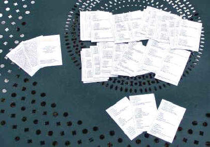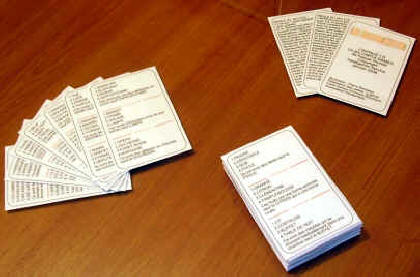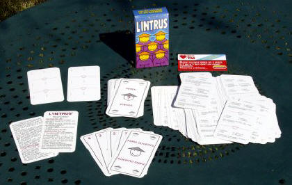 Le principe est déjà adopté : des listes de mots ou d'expressions, parmi lesquelles il faut découvrir l'intrus. Initiative sympathique : l'auteur a laissé deux cartes vierges, pour que chacun puisse ajouter ses propres défis, éventuellement dans des domaines qui touchent à la famille ou aux amis. 2006 : édition Carta GamesL'Intrus est un jeu de Pascal Thoniel, un spécialiste des jeux d'esprit. Le jeu avait été édité par Habourdin en 1991. Le voici réédité par Carta Games, la maison d'édition de l'auteur.