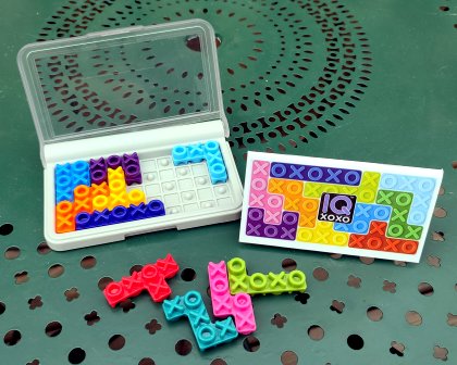 On pourrait croire que IQ Xoxo n'est qu'une énième version du classique Pentomino. Mais, car il y a un mais, chaque pièce est marquée de X et de O en alternance. Et bien entendu quand on pense pouvoir placer une pièce, elle ne rentre pas car les O ne sont pas en face des picots du socle du jeu.