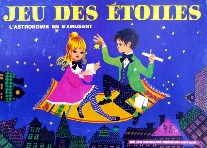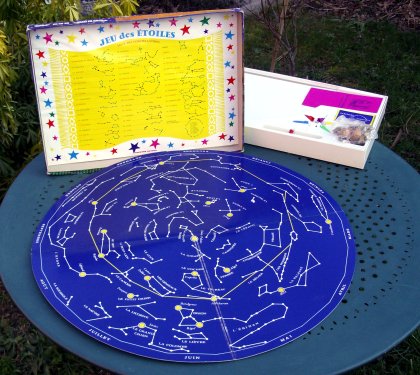 Autant vous prévenir tout de suite : le Jeu des étoiles a bercé mon enfance, et le simple fait d'en ouvrir la boîte suffit à m'émerveiller aujourd'hui encore. Ne vous attendez donc à aucune objectivité de ma part ! Le principe général est tout simple : faire des courses en allant d'une étoile à une autre, par le plus court chemin possible. On avance le long des constellations, selon le résultat d'un dé dodécaédrique (un D12, comme disent aujourd'hui les djeuns). Parfois, il faut passer d'une constellation à une voisine, et on utilise alors une règle graduée pour apprécier les distances. Quand j'étais enfant, j'adorais ce jeu qui était censé m'apprendre les noms et les emplacements des étoiles. J'en ai à peu près retenu la même chose que de mes nombreuses années d'anglais scolaire, mais la magie demeure. |