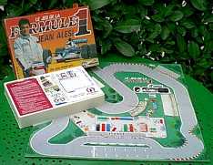 Dans la traditionnelle valise Ferriot, voici Le Jeu de la Formule 1, « avec Jean Alesi ». J'ai cherché partout, je n'ai pas trouvé le sac de gravier qui va généralement avec ! La règle du jeu est pitoyable d'inintérêt. Autant la piste, les petites voitures et les cartes sont belles, autant la règle est affligeante. La seule façon de gagner est le hasard. Aucune stratégie n'est applicable : on lance les dés et on avance… Le seul cas où le joueur peut exercer un choix est le moment où il s'arrête au stand pour changer de pneus. C'est tout. Le temps d'arrêt au stand, par exemple, n'est que hasard : 1 ou 2 = passe 1 tour, 3 ou 4 = passe 2 tours, 5 ou 6 = passe 3 tours. |