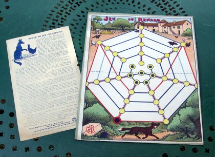 Le Jeu du renard ne doit pas être confondu avec Le Renard et les Poules, même si les thèmes sont similaires. Celui dont nous parlons ici, édité par la Manufacture Lyonnaise de Jouets probablement au début du xxe siècle, se pratique sur un tablier tout à fait original où les traits de liaison, selon leur couleur, sont autorisés à l'un et l'autre camp. Les poules, situées au début de la partie sur les cases noires, doivent atteindre la cour de la ferme en haut du plan de jeu. Pour cela, elles doivent d'abord s'approcher de la forêt où le renard se régale d'avance. Diverses adaptations sont proposées par la règle pour rendre les chances de l'un ou l'autre joueur plus importantes. Le jeu présente surtout de l'intérêt pour sa grille de jeu tout à fait originale, mais ne passera pas à la postérité. Fabriquer son jeu