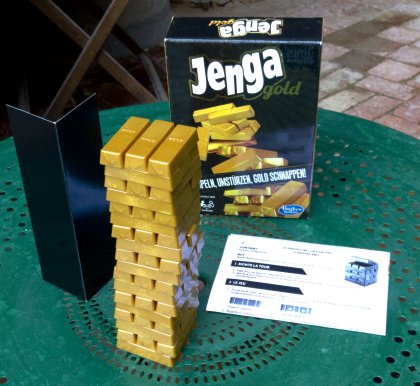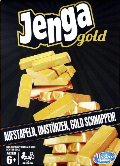 Dans la famille Jenga, voici Jenga Gold ! Les bâtonnets de bois sont remplacés par des lingots (la règle précise, à l'attention des personnes à compréhension limitée, que les lingots ne sont pas en or véritable). Parmi les 54 pièces, 21 sont marquées au-dessous d'une étoile. Lorsque vous extrayez une pièce, vous la conservez si elle comporte une étoile et vous la replacez au sommet dans le cas contraire. Lorsque la tour s'écroule, chacun essaye de récupérer, dans les décombres, les lingots marqués d'une étoile. Puis chacun compte combien il possède de « vrais » lingots pour déterminer le vainqueur. Une variante un peu plus dynamique que le jeu traditionnel.