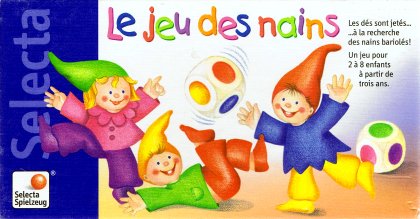 Le Jeu des nains est composé de cinquante-six cartons représentant des lutins. Le nombre de cinquante-six n'est pas obtenu par hasard, c'est le nombre de combinaisons avec répétition correspondant à trois valeurs parmi six. Ça tombe bien puisque le but est de trouver le lutin dont les couleurs correspondent à un lancer de trois dés colorés : six lutins portent une seule couleur, trente portent deux couleurs et vingt ont des vêtements de trois couleurs différentes. Un jeu d'observation rapide amusant.
