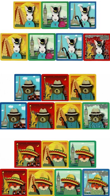 Les six combinaisons ci-dessus rapportent 4 points : le lapin à haut-de-forme est présent à Mexico, Londres et Paris, et il possède en plus un sac et un parapluie ; l'ours à panama est présent à Paris, New York et Mexico, et il possède en plus un sac et un parapluie ; le renard à chapeau mexicain est présent à New York, Mexico et Londes, et il possède en plus un sac et un parapluie ; Ces combinaisons rapportent toutes 4 points. À chaque fois, le même personnage avec la même coiffure est également présent dans la quatrième ville. Mais comme il y pleut, le bonus de quatrième carte et le malus de pluie s'annulent : toujours 4 points.