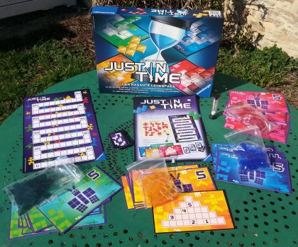 Les lecteurs qui me connaissent savent que je raffole des jeux avec des pentaminos. C'est une fois de plus Ravensburger qui nous propose un jeu autour de ces très ludiques éléments, après Forma, Tantalus, Fits et Bits. L'auteur, Günter Burkhardt, nous avait déjà proposé, toujours chez Ravensburger, un jeu basé sur les polyformes avec Casa Grande. Ici, il s'agit de réaliser le plus rapidement un score intéressant en plaçant ses pièces sur une grille, de sorte que les valeurs les plus grosses, et donc le plus rémunératrices, apparaissent. Déjà, placer toutes les pièces dans l'espace restreint n'est pas une mince affaire. Laisser des gros nombres visible complique bien encore ! Quand un joueur est parvenu à un total, il ne reste que quelques secondes aux autres pour trouver une solution, qui doit être obligatoirement différente. L'auteur a prévu un intelligent mécanisme pour ne pas décourager les joueurs en retard : Le dernier au score bénéficie d'une pièce spéciale carrée, sorte de joker, qu'il peut poser à la place d'une autre pièce. Généralement, ce coup de pouce suffit à revenir dans les scores.