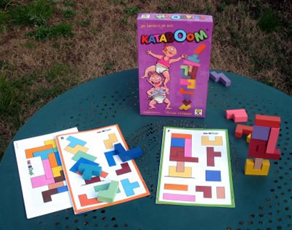 André Perriolat réinvente le Badaboum !, en utilisant six pentaminos et quelques « pentaminis ». Diverses règles sont proposées pour un à quatre joueurs. À noter que les pièces de Kataboom sont identiques à celles de Gagne ton papa !, si l'on retire les petits cubes. |