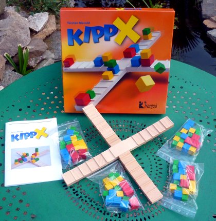 Lorsque j'avais chroniqué Kippit, l'ancêtre de Kipp X, je regrettais qu'il soit limité à deux joueurs. Voilà qui est réparé. Kipp X n'est cependant pas tout à fait une version à quatre, puisque la règle change de manière assez importante. Dans la version précédente, la technique consistait à empiler des cubes de manière instable, puis à poser le cube fatidique qui faisait tout tomber, les pièces ayant chuté revenant à l'adversaire. Maintenant, tout ce qui tombe vous revient, sachant que le but du jeu est de se débarrasser de ses cubes. Kipp X change donc de catégorie pour entrer dans celle du stop ou encore. À votre tour, vous ajoutez autant de cubes que vous le désirez sur une des branches hautes de la bascule, au moins un. Votre tour se termine dans trois cas :