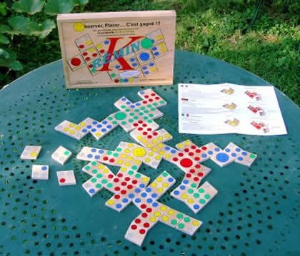 Les dominos de K, ré, mi, no comportent de une à trois couleurs. Comme d'habitude, il s'agit de raccorder les dominos entre eux, en faisant coïncider les couleurs. Là où K, ré, mi, no se démarque, c'est dans la forme particulière, en losange, qui implique une façon différente de jouer.
