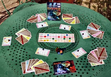 Ce n'est pas un hasard si Kryptos rappelle Code de Vinci puisque l'auteur reconnaît que le jeu de Hiroaki Suzuki et a largement inspiré le sien. De 2 couleurs et 24 pièces, on passe ici à 4 couleurs et 48 cartes. On peut regretter que des cartes aient été préférées à des dominos, et ce d'autant plus qu'il est malaisé de tenir en main 10 cartes suffisamment écartées pour qu'on puisse lire les valeurs (il aurait pourtant suffi que les valeurs soient inscrites plus au bord de la carte). L'idée est de trouver les cartes cachées dans les mains des adversaires. On dispose de renseignements : les cartes déjà trouvées, celles qu'on voit dans sa main, les couleurs des cartes restant à découvrir et… les questions posées par les adversaires. Le jeu est astucieux, particulièrement intéressant à quatre, cinq ou six joueurs. Pour trois joueurs, deux cartes mystérieuses sont mises de côté et ne seront jamais révélées.
