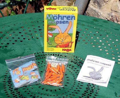 Au début de la partie, toutes les cartes cachées sont des lapins. Il est donc facile de retourner un lapin et donc de gagner une carotte. Mais chaque lapin trouvé est retiré et remplacé par un renard et il devient de plus en plus difficile de trouver un lapin. On peut alors choisir de lancer le dé qui résoudra peut-être nos problèmes. |