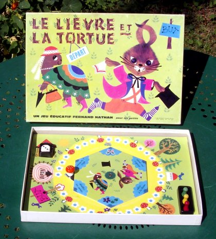 Le Lièvre et la Tortue, version Fernand Nathan 1968, est un Jeu de l’oie, auquel on ajoute des cases changeantes. Au centre du tablier, un tourniquet pointe six cases. Chaque fois qu'un joueur arrive sur un champignon, il doit tourner le tourniquet pour amener la flèche noire (avec le gros champignon) en face de sa case, ce qui peut modifier le parcours. Nos équipes sont toujours à la recherche du rapport entre ce jeu et le célèbre conte. Nous ne manquerions pas d'interrompre les programmes si une telle découverte survenait. Un titre idéal pour les collectionneurs de « jeux contenant le mot tortue ». |