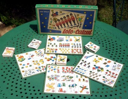J'entends au loin le lecteur étonné qui se dit « Tiens, un Loto ! Et pourquoi celui-ci a-t-il droit à une présentation pour lui tout seul, alors que ses confrères sont tous regroupés sur une seule fiche, en dépit de leur multitude et de leur variété ? » La raison en est que la règle est légèrement différente. L'animateur de la partie de Loto Calcul tire une carte et annonce le motif représenté sans la quantité. Par exemple « Soldats » ou « Cochons ». Le joueur doit alors, pour prétendre gagner la carte, annoncer la valeur de celle-ci. On n'est donc plus tout à fait dans le jeu de hasard pur, même si on n'en est pas très éloigné. Une autre raison de la présence de Loto Calcul dans ma collection est que je le trouvais trop mignon…