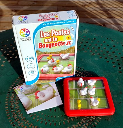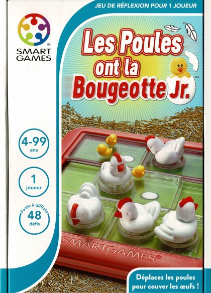 Les poules ont la bougeotte Jr. est la version pour 4 ans et plus du jeu Les poules ont la bougeotte qui s'adressait à des joueurs à partir de 6 ans. On est devant un dérivé du classique taquin avec une astuce : les plaquettes ont une taille de 2×1 cases et, parfois, il faut positionner une tuile au centre de sa ligne pour résoudre le défi. La version junior bénéficie d'un matériel bien plus agréable, avec des petites poules qui picorent en pivotant sur leurs pattes. Comme d'habitude, les défis sont de difficulté croissante, même si les premiers sont accessibles aux assez jeunes joueurs. Important : il faut bien respecter l'orientation du jeu et des cartons. On peut se tromper et chercher une solution pendant des heures. L'éditeur aurait peut-être dû penser à un format de cartes non carrées.