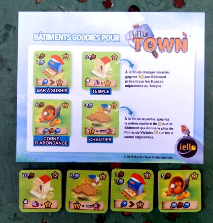 2019 : 4 tuiles supplémentairesSur le site de l'éditeur, on découvre l'existence de quatre tuiles goodies. Vous pouvez imprimer les faces et les dos de ces quatre tuiles et les coller sur du carton épais pour encore plus de plaisir. La page à imprimer est à la fin des règles en téléchargement.