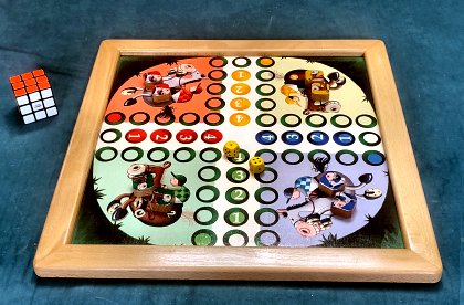 Méfiez-vous des apparences. Ludo Dadas XXL ressemble à un Jeu des petits chevaux et les pions sont des chevaux mais la configuration du tablier est bien celle d'un Ludo. Avec son parcours restreint et deux pions seulement par joueur, les parties ne durent pas trop longtemps. Ouf ! |