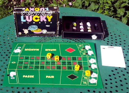 Lucky Number est un jeu de roulette… sans roulette ! En fait, elle a été remplacée par deux dés qui génèrent un nombre compris entre 1 et 36. Quant au zéro, il est simulé par deux autres dés à six faces comportant trois cochons mâles, deux cochons femelles et un zéro.
