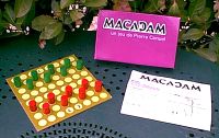 Les mécanismes sont très simples, et parfaitement décrits sur le site de l'auteur, Pierre Canuel. L'idée est d'aller porter un pion dans le but opposé, formé par les deux cases centrales de la dernière rangée adverse. Pour cela, deux possibilités. On peut faire un déplacement orthogonal (horizontal ou vertical) dans son propre camp, sans sauter aucun pion, aussi loin que l'on souhaite. Ou alors, on peut se déplacer comme aux Dames chinoises, par saut de pions successifs, mais en ne sautant que ses propres pièces. Macadam a été créé à l'occasion d'un projet pédagogique. Des damiers avaient été tracés sur les trottoirs proches des écoles et collèges, et les règles distribuées aux élèves. Le principe de Macadam, et sa vivacité d'exécution, ont été inspirés par le basket : déplacement rapide, passes, puis panier ! Rien ne vous empêche de renouveler cette propagation dans votre ville ou votre quartier. Signalez à Pierre Canuel toute initiative en ce sens. Je crois que vous lui ferez plaisir en répandant Macadam, qu'il offre gracieusement à la communauté via son site internet. N.B. : Pierre ne fait pas que des jeux. Sur son site, vous pouvez également lire le texte de ses chansons, et même en écouter quelques unes. |