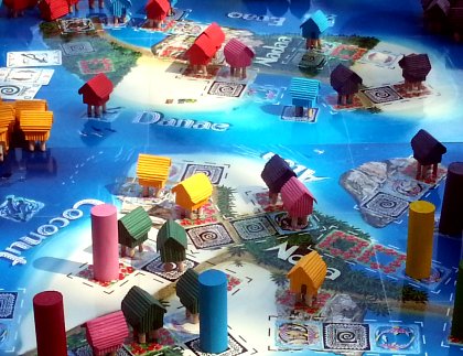 Variante de fin de partie (Haapii Maka Bana)Pour rendre moins chaotique la fin de partie, j'ai adopté une variante « halte aux peintres », qui semble bien appréciée, et que je vous propose d'adopter. Si, à la fin d'un tour, un joueur a construit neuf de ses dix paillotes, il
