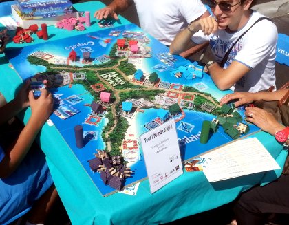 devient interdit d'utiliser la peinture au tour suivant (le dernier). Cette variante évite les gros changements de classement en fin de partie, et favorise l'usage précoce des cartes de peinture. Cette variante devient la règle officielle dans la seconde édition de 2009. 2008 : Райский островUn immense merci à Paul, qui m'a fait rapporter de Moscou une boîte de Райский остров (L'Île de paradis), édité par Zvezda ! La boîte coûte là-bas 700 roubles, soit environ 16 €. Pour cette somme modique, vous aurez droit à une jolie boîte à pizza et à un plan de jeu en carton ondulé, légèrement plus grand que l'original.