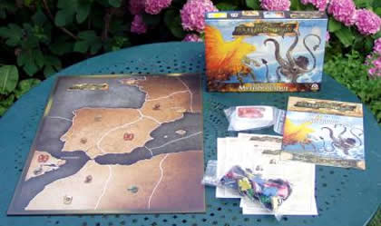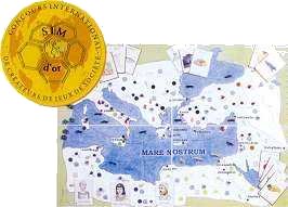 Le plan de jeu sobre et splendide détaille les régions et leurs ressources. Il est rapidement encombré par de nombreux pions en bois ou en carton. Je trouve personnellement dommage que l'esthétique ait parfois été poussée au détriment d'une lecture facile. Les pions en carton, en particulier, se ressemblent trop. Mais comme ils ne changent pas souvent de place, ce n'est pas très grave. Mare Nostrum me laisse une impression étrange. Les règles sont finalement assez simples, et j'ai pu faire jouer des amis qui n'étaient pas spécialement de grands stratèges. Mais la durée d'une partie (compter une grosse soirée), ainsi que la complexité des décisions à prendre en font clairement un jeu pour joueurs avertis. On pourrait reprocher à tel pouvoir d'être trop puissant, à telle nation d'être avantagée… Ce serait oublier qu'il s'agit d'un jeu multi-joueurs. C'est à chacun de ne pas trop favoriser celui qui l'est déjà par les dieux ! Serge Laget a toujours dit qu'il avait créé Mare Nostrum pour retrouver l'ambiance de Civilisation avec une durée nettement abrégée. En ce sens, il a parfaitement tenu son objectif : on parle encore de la partie des heures plus tard, et ce n'est pas tant l'issue qui compte, que les stratégies qu'on a pu mettre en œuvre ou qu'on se propose de mettre en œuvre la prochaine fois. On s'assoit autour du plan de jeu pour une soirée. Le pari osé de refaire un jeu « à l'ancienne » est parfaitement réussi. Bravo Serge ! 2005 : Extension Mythologique