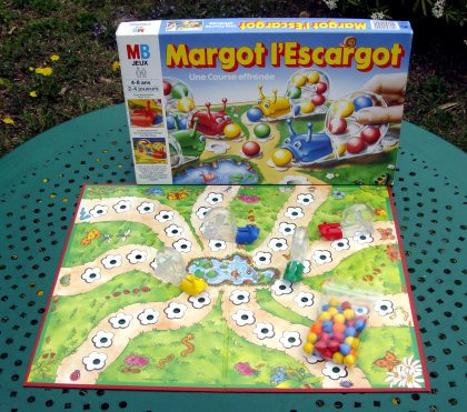 Des billes de trois couleurs sont disposées au hasard sur les 8 chemins. Le joueur dont c'est le tour jette un dé, qui lui donne la couleur des billes qu'il peut avaler avec son escargot. Il choisit alors le chemin où la première bille est de cette couleur, et où se trouve le plus de billes de cette couleur à la suite. Le premier qui a rempli son escargot gagne la partie. On le voit : Margot l'Escargot est un jeu réservé aux très jeunes joueurs. Le problème, c'est qu'à cet âge, on trouve bien plus drôle d'arracher les cornes que de jouer à la règle proposée. Les jeunes amateurs de courses de gastéropodes préféreront certainement le joli Allez les escargots !. |