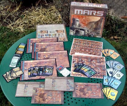 Heureusement que le jeu est astucieux, car il n'est guère sexy. Les seules notes de « couleur » sont les colons représentés par de petits pions blancs de la taille d'un cachet (non sécable). Mars est à rapprocher des autres jeux de colonisation, tels que Puerto Rico ou Les Colons de Catane. Le principal intérêt du jeu réside dans l'importante interaction entre les joueurs qui peuvent s'échanger, de gré ou de force, les éléments nécessaires à leur entreprise colonisatrice. Chacun peut orienter sa colonie comme il le souhaite, en développant par exemple des unités militaires ou, au contraire, des centres de recherche. La durée du jeu est bien fixée, et peut être ajustée selon l'objectif qu'on se fixe en points de victoire. On a le temps de développer une stratégie, voire de changer son fusil d'épaule, si on est contrarié dans ses intentions. En fait, il ne manque qu'une seule chose dans le jeu : une unité de production de peinture, pour repeindre la planète de manière un peu plus chatoyante |