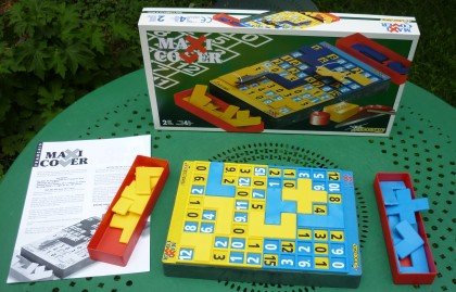 Si le matériel de Maxi Cover est visiblement attrayant, la règle n'est malheureusement pas à la hauteur. Le plan de jeu comporte des nombres de 0 à 10, dispersés entre cases jaunes et bleues selon une symétrie parfaite. Chacun possède les onze mêmes pièces couvrant de deux à cinq cases. Les chances de Bleu et de Jaune sont donc les mêmes au départ. À tour de rôle, chacun doit prendre une de ses pièces et la placer sur la grille, masquant ainsi de deux à cinq nombres. Le but est de laisser le moins de cases possible de sa couleur, avec les valeurs les plus faibles pour ne pas perdre trop de points. Les carrés des pièces qu'on n'a pas pu poser viennent également en décompte négatif. Quel dommage que la règle soit aussi simpliste. On imagine aisément des contraintes et des règles beaucoup plus intéressantes pour tirer parti du joli matériel :