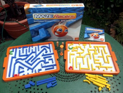 Un jeu qui oppose deux adversaires qui doivent terminer le premier un labyrinthe, ce n'est pas nouveau. Déjà, en 1961, Capiépa proposait cela avec son jeu Fascination. La nouveauté, avec Maze Racers, c'est qu'en plus chacun doit préalablement composer un labyrinthe qu'il soumettra à son adversaire. Un labyrinthe est constitué d'une aire de départ, d'une ère d'arrivée et de barrières magnétiques que chacun dispose comme il le souhaite. Bien sûr, au moins un chemin doit mener du départ à l'arrivée. Chacun prépare son labyrinthe et quand un joueur pense avoir terminé le sien, il retourne un sablier qui laisse alors une minute à son adversaire pour terminer le sien. On donne le top départ et chacun doit alors faire rouler la bille du départ à l'arrivée puis à nouveau jusqu'au départ. Le plus rapide gagne la partie. Le nombre important de pièces laisse beaucoup de place à l'imagination. Les joueurs disposent d'un bâtonnet étalon qui permet de vérifier si les couloirs créés sont de largeur suffisante pour laisser circuler la bille. Très belle idée et réalisation parfaite.