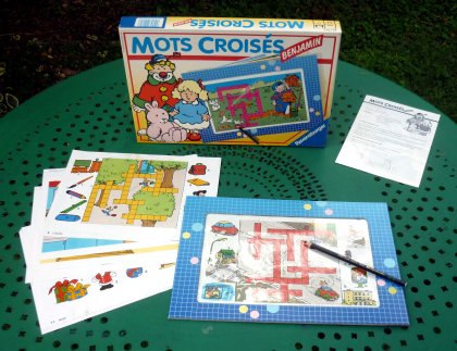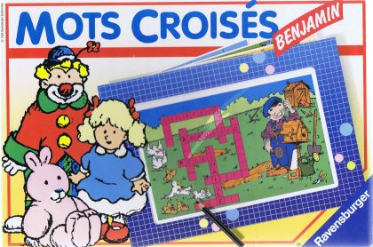 Mots croisés benjamin est un jeu solitaire ou coopératif, dans le même esprit que Mots croisés pour les petits. La seule différence est sémantique : ceux qu'on appelait en 1972 les « petits » sont devenus des « benjamins », pendant que leurs grands-parents passaient du statut de « vieux » à celui de « seniors ». Le matériel est bien pratique : chaque grille se place derrière un écran translucide sur lequel on écrit avec un crayon effaçable.