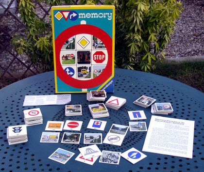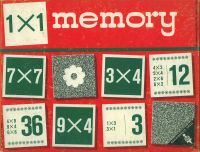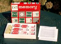 Memory 1 × 1, daté de 1969, présente une originalité par rapport aux autres jeux de la gamme : les deux cartes de chaque paire sont différentes ; l'une indique une opération (3 × 7, 4 × 2 etc.), l'autre comporte la solution. Le dos des cartes « Problème » et « Solution » sont différents. Memory 1 × 1 est livré avec deux règles. La première est celle du classique Memory. La seconde est un jeu de rapidité et de réflexe. Un joueur annonce les coordonnées d'une carte (par exemple H4 pour ligne H et colonne 4) et il faut être le premier à annoncer les coordonnées de la carte solution correspondante. 1979 : Memory code de la routeApprendre le code de la route avec un Memory ? Pourquoi pas. Le jeu est daté de 1979. Chaque paire de cartes est formée d'un panneau et d'une situation