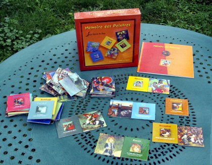 2006 : Mémoire des peintresÉdité en 2006, le jeu Mémoire des peintres utilise le classique mécanisme du jeu de paires pour nous faire découvrir quelques peintres. Les deux cartes associées ne sont pas identiques. L'une représente l'œuvre, l'autre un détail de cette œuvre.