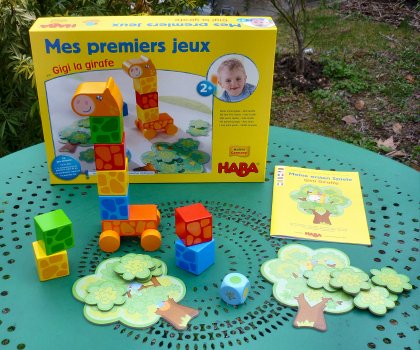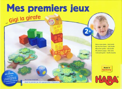 La gamme « Mes premiers jeux » s'adresse aux très jeunes joueurs, à partir de deux ans. Les titres proposés sont à la frontière entre jouet et jeu, mais puisqu'ils comportent une règle, il s'agit bien de jeux. Dans Mes premiers jeux - Gigi la girafe, il s'agit de promener une pile en équilibre précaire de place en place, un peu comme dans Bären Stark ou Die Abenteuer des Kapitän Wackelpudding. Ici, la pile est une girafe à roulettes (probablement OGM), dont le cou grandit peu à peu. Selon l'âge des protagonistes, on peut éloigner plus ou moins les deux arbres entre lesquels Gigi se promène. Les joueurs plus âgés prennent un malin plaisir à poser les cubes de guingois, ce qui donne une girafe assez curieuse. Très beau matériel, comme d'habitude chez Haba.