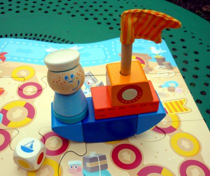Selon le dé, on avance Martin sur une case, on passe son tour en l'applaudissant ou on avance le bateau — mais pas trop vite, sinon on risque de perdre ! Parfois, Martin arrive sur une case où il s'agit d'assembler les éléments du bateau. La pièce est alors placée sur le mât de même teinte (tout est pensé pour les tout-petits). La dernière pièce à placer est aussi celle qui demande le plus de précision : le drapeau, sans lequel aucun bateau digne de ce nom ne peut prendre le large. Quand tout se passe bien, on arrive à temps pour embarquer ! Les statistiques de ce jeu de pur hasard sont heureusement assez favorables aux joueurs !