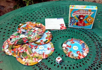 Meuh où est La Vache qui rit ? fait partie d'une série de petits jeux développés sous licence de la célèbre vache lédonienne. Quatre de ces jeux sont des adaptations de classiques : loto, domino, memory et jeu de cartes. Deux jeux sont un peu plus originaux : celui-ci et Meuhli Meuhlo La Vache qui rit. La règle du jeu consiste à pointer le plus vite possible la vache qui apparaît sur le dé parmi les six qui figurent sur la carte. Rien de bien nouveau. Chaque carte est décorée d'une photo panoramique d'un coin de France qu'on peut s'amuser à rechercher. Si vous collectionnez fébrilement tout ce qui a trait à La Vache qui rit, il vous faut clairement posséder ce jeu. Sinon, on doit pouvoir survivre sans…