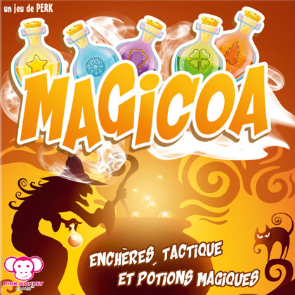 Magicoa est un jeu de levées. Au centre de la table, cinq cartes potion sont à gagner. Chacune d'elle ira au joueur qui aura posé en face la carte la plus forte. Comme dans Stupide Vautour !, tous les joueurs ont une main identique au départ. Ils devront engager ces douze cartes, deux par deux, lors de six tours de jeu. La contrainte, c'est que vous devez choisir secrètement et simultanément les deux cartes que vous allez engager et dans quel ordre. Puis, à tour de rôle, chacun va révéler sa première carte et la poser en face de la potion convoitée ; on fera de même pour la deuxième carte. Les potions gagnées ont une valeur. Certaines ont également un pouvoir, mais vous devrez choisir immédiatement si vous voulez gagner les points ou acquérir le pouvoir. Le jeu est astucieux et les plus habiles sorciers devraient y briller. Les règles sont faciles et rapides à expliquer. Il n'est pas rare qu'on subisse un sortilège qui oblige à enchaîner les parties.