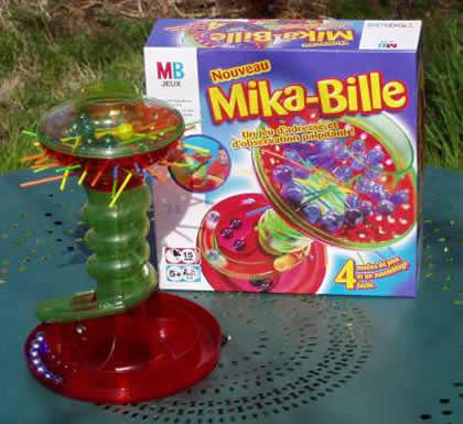 Les billes sont placées sur un enchevêtrement de baguettes de mikado. Les joueurs retirent tour à tour des baguettes, en espérant qu'aucune bille ne tombe. Pour éviter qu'on ne perde la règle, MB a eu la bonne idée de l'imprimer sur les côtés inférieurs de la boîte. Il faut parfois un bon moment pour penser à y regarder ! Plumez-la chez Trends