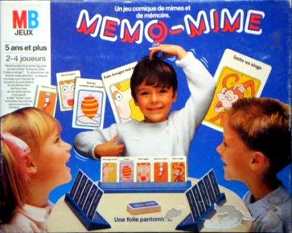 Mémo-Mime : des cartes indiquent des actions à réaliser. En soi, elles ne sont pas compliquées : chanter une chanson, sautiller, imiter une poule etc. Mais vous ne voyez ces cartes qu'une seule fois. Elles sont ensuite tournées vers les autres joueurs. Chaque fois que votre tour revient, vous devez ajouter une nouvelle carte à celles déjà exposées, puis exécuter la séquence complète. Le premier qui se trompe est de corvée de vaisselle pendant la fin de la semaine. |