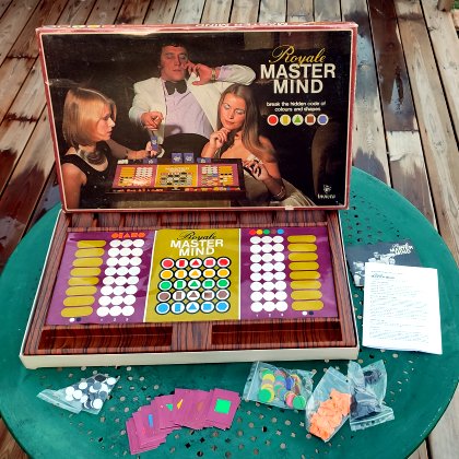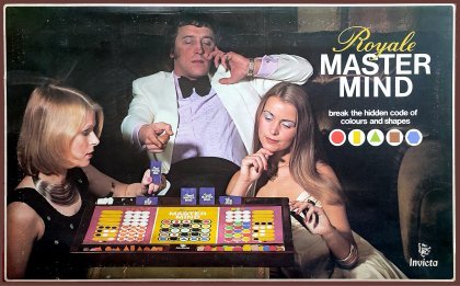 Mastermind Royale est une variante de Mastermind pour 2 ou 3 joueurs. Les petites cartes permettent de choisir les codes à découvrir. Selon l'option choisie, une ou deux personnes essayent de découvrir les formes sur le tableau de gauche et les couleurs sur celui de droite. Le principal intérêt de cette boîte de jeu, en dehors de sa taille exceptionnellement grande, c'est son image de couverture ! Sa suffisance est le codeur, deux nunuches sont les chercheuses. Elles se tiennent du mauvais côté du jeu et n'ont visiblement pas compris que le code est sur les petites cartes qu'elles peuvent voir. La chercheuse à gauche a peut-être compris qu'il fallait regarder les cartes, mais c'est le verso qu'elle regarde attentivement. Les deux ont d'ailleurs trouvé les solutions puisque trois pions noirs ont répondu à leurs dernières questions ; mais elles continuent cependant à chercher ! On ne pourrait plus publier une telle couverture aujourd'hui, même en prétendant jouer du second degré. Au musée !