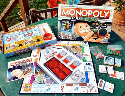 Sur une trame classique, Monopoly Faux Billets apporte une petite nouveauté amusante : certains billets et certaines cartes chance sont des faux. Heureusement, ces faux sont détectables grâce à un décodeur (un filtre à fines rayures), ce qui permet de les confisquer au fraudeur. À la fin de la partie, vrais et faux billets sont comptabilisés de la même façon !