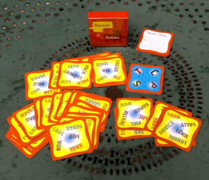 Basé sur le classique jeu de devinettes, Monsieur et Madame s'adresse particulièrement aux joueurs imaginatifs. Deux cartes sont visibles sur la table. L'une avec cinq prénoms, l'autre avec quatre initiales. Il s'agit de trouver rapidement un jeu de mots amusant et de proposer ensuite le nom de famille aux autres joueurs. Si quelqu'un trouve le prénom, le questionneur comme le trouveur gagnent chacun une carte. Il y aura deux gagnants : le meilleur proposeur et le meilleur trouveur. Le nom peut être avant ou après le prénom. Il faut donc annoncer dans le bon ordre.