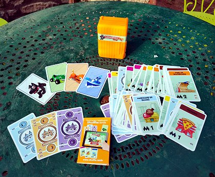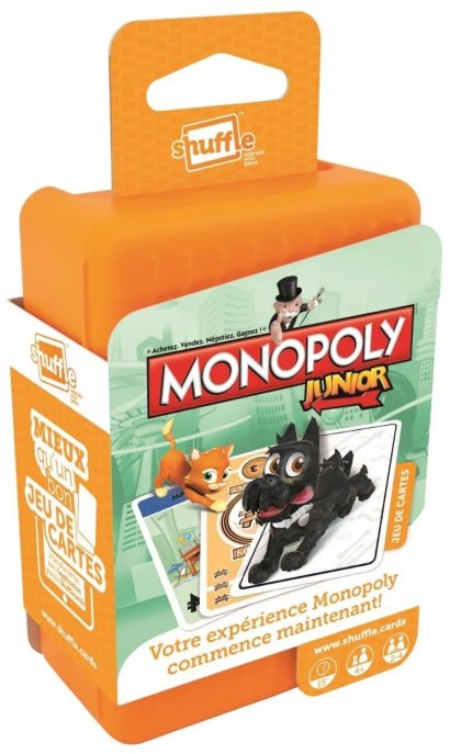 On ne compte plus les jeux dérivés du Monopoly. Pour ajouter à la confusion, ces jeux portent souvent le même nom. On trouve ainsi, en plus du présent Monopoly Junior - Shuffle, deux jeux presque homonymes dans la collection de l'Escale à jeux : Monopoly Junior - À la fête foraine et Monopoly Junior - My Little Pony (BoardGameGeek en dénombre déjà une vingtaine en 2022). Monopoly Junior - Shuffle est un peu le résultat du mariage entre les versions junior du Monopoly et le très bon Monopoly Deal. On ne s'embarrasse plus de pions et de dés. Quelques cartes suffisent pour jouer avec toujours le même objectif : réunir des familles de propriétés. L'astuce, c'est que la carte pion d'un joueur, lorsqu'elle se trouve sur une propriété, autorise son propriétaire à percevoir un loyer si un adversaire gagne une carte de cette même couleur. La règle, très simple, permet des parties courtes, ce qui sera apprécié des parents