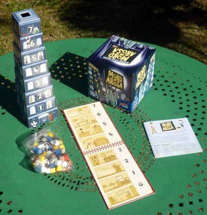 La création ludique fait rarement appel à notre ouïe (si l'on excepte tous les jeux où il faut écouter religieusement quarante minutes d'explication de règle avant de pouvoir enfin jouer). Heureusement, quelques auteurs s'y essayent et produisent parfois des œuvres qui méritent notre attention. Mord im Arosa est un jeu amusant basé sur notre qualité d'audition. Tout se passe dans ce grand bâtiment composé d'étages percés d'un trou au centre. Tout au long de la partie, on va y jeter des petits cubes en bois, et il faudra être attentif pour déterminer à quel niveau leur chute s'est arrêtée. La règle est vite apprise et le jeu plaît autant aux jeunes qu'à leurs parents. Mon conseil : évitez de jouer à Mord im Arosa à côté d'une partie de Comme des sardines… !