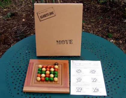 Le but est de réaliser un alignement de cinq billes de sa couleur ou de quatre billes de sa couleur plus la noire, qui fait office de joker. Au départ, on forme une croix « X » avec les billes neutres blanches. Puis les joueurs posent tour à tour leurs billes sur les emplacements libres. Enfin le premier joueur pousse une première rangée avec la bille noire, faisant ressortir une bille en face. Son adversaire prend cette bille et la pousse sur une autre rangée. Si un alignement orange et un alignement vert se forment en même temps, c'est le joueur qui vient de pousser qui gagne. Cette mini-présentation de Move est dédiée à Hélène… |