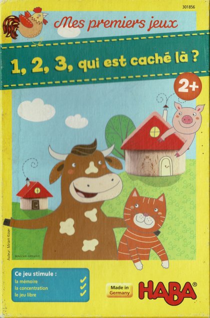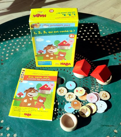Mes premiers jeux - 1, 2, 3, qui est caché là ?, ce sont deux petits jeux de mémoire où l'on doit retrouver des animaux cachés dans des maisons. Règles minimalistes pour très jeunes joueurs.