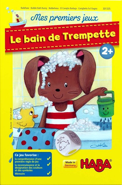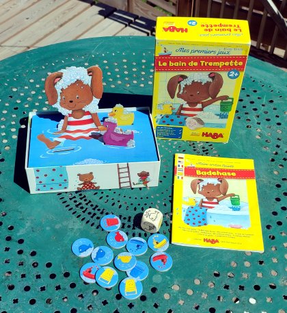 Comme de nombreux jeux de la gamme Haba - Mes Premiers Jeux, Mes premiers jeux - Le Bain de Trempette propose plusieurs règles autour d'un matériel commun : une boîte de jeu faisant office de baignoire, un lapin et des accessoires de bain. La règle principale, basée sur la mémoire, fonctionne très bien avec les jeunes joueurs. Il faut trouver un accessoire qui a soit la couleur soit le symbole indiqué par le dé.
