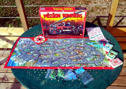 Mission pompiers a été créé par un pompier, visiblement dans un but de promotion de cette activité. On joue en mode compétitif mais les camions de pompiers appartiennent à tous. Les cartes mission sont remportées par le joueur qui aura tous les jetons demandés par cette carte même si c'est un autre joueur qui a amené le camion sur le lieu de l'intervention. L'auteur du jeu s'étonnait qu'il n'existe aucun jeu sur le thème des pompiers. Il n'était peut-être pas au courant qu'on trouve aussi des jeux ailleurs que dans les rayons des grandes surfaces à Noël !